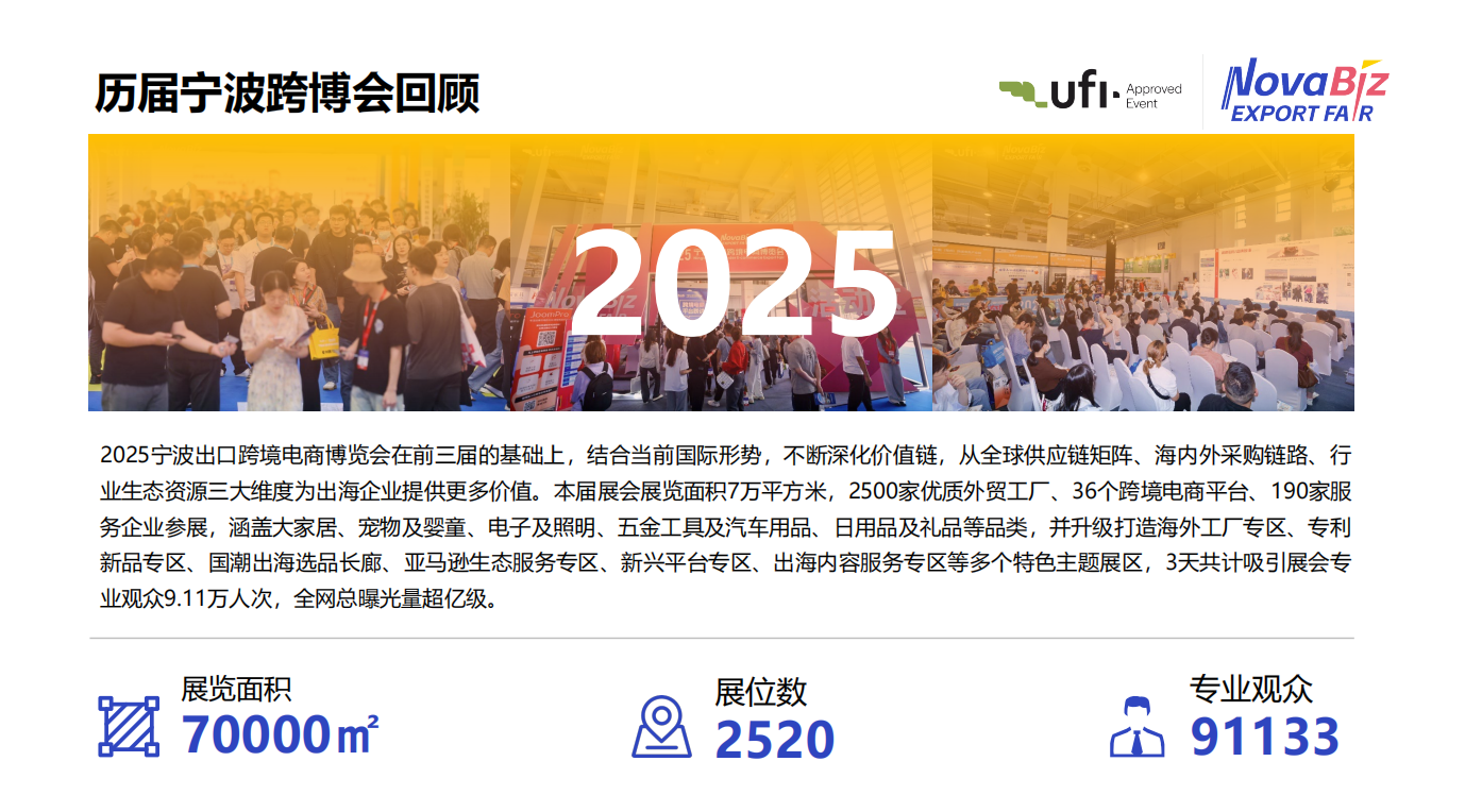 宁波跨博会作为“华东跨境第一展”,是目前国内最具号召力的跨境高端专业展之一,也是 国内唯一以“大家居”为核心品类的展会。同时,宁波跨博会一直是跨境电商中长线行业红 利的风向标,见证了跨境电商正式从“外贸新业态”向“外贸增长主赛道”的跨越。 ...
